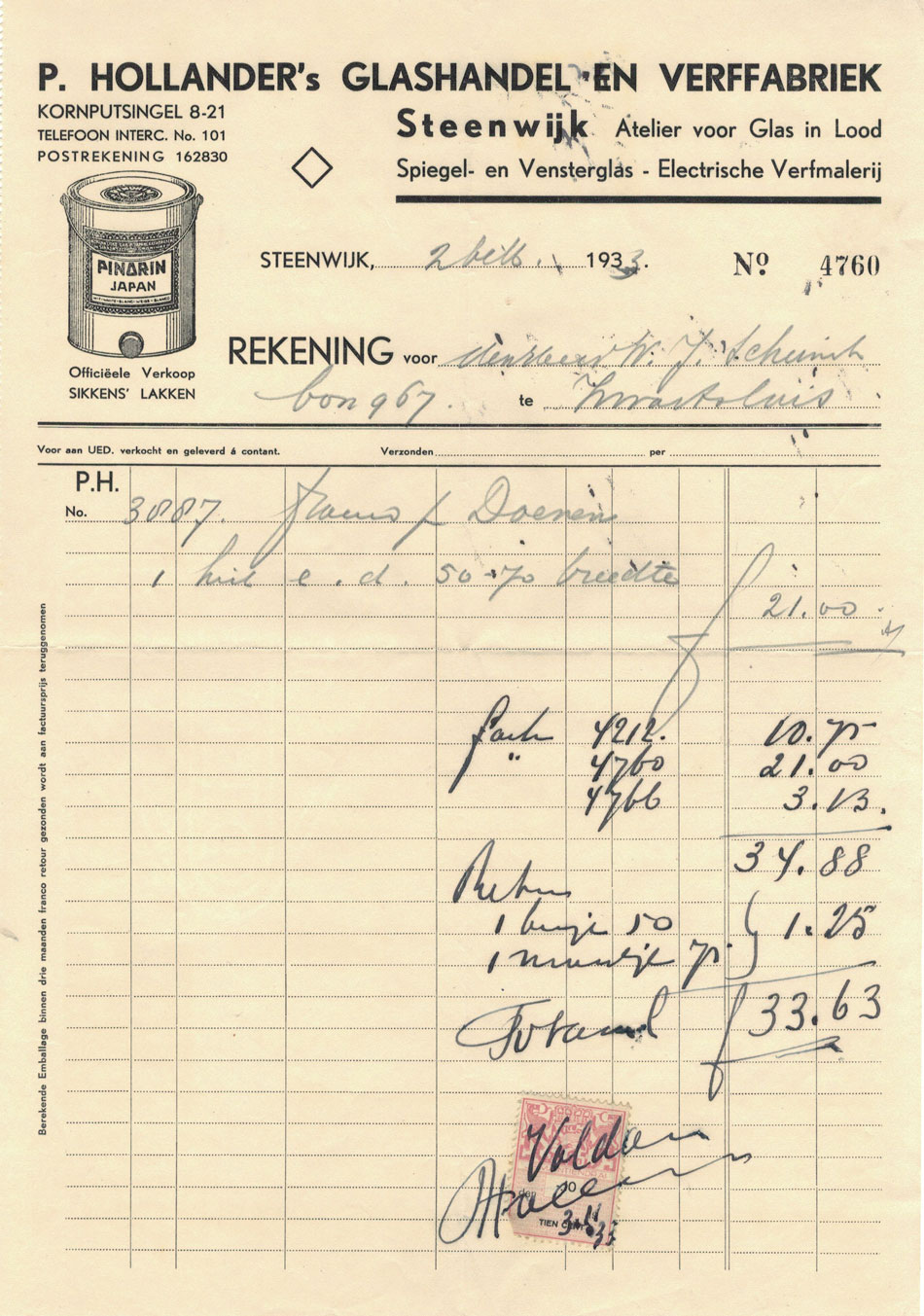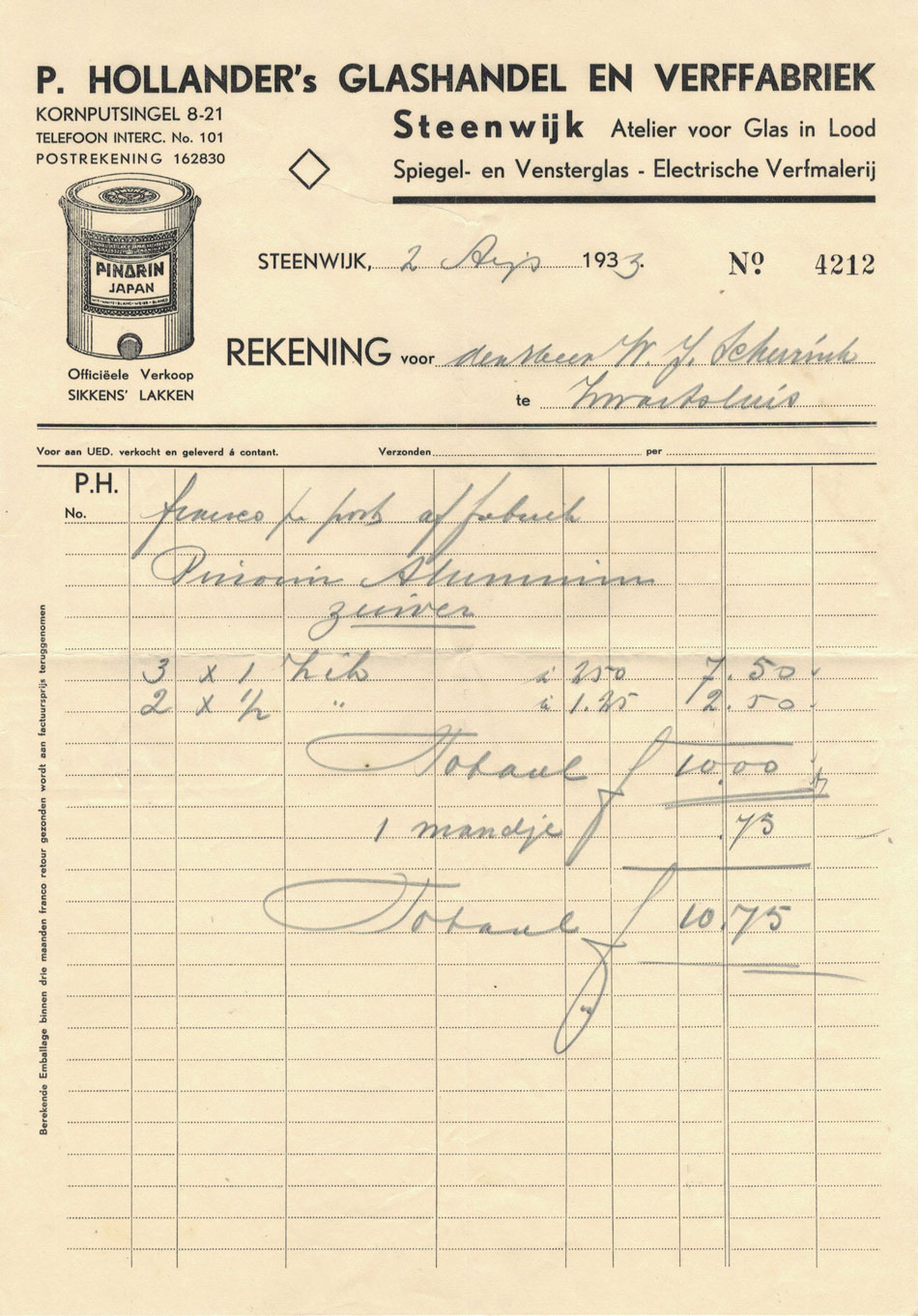 Rekening uit 20-10-1933; links onder hoekje afgescheurd, verder heel mooi, € 12