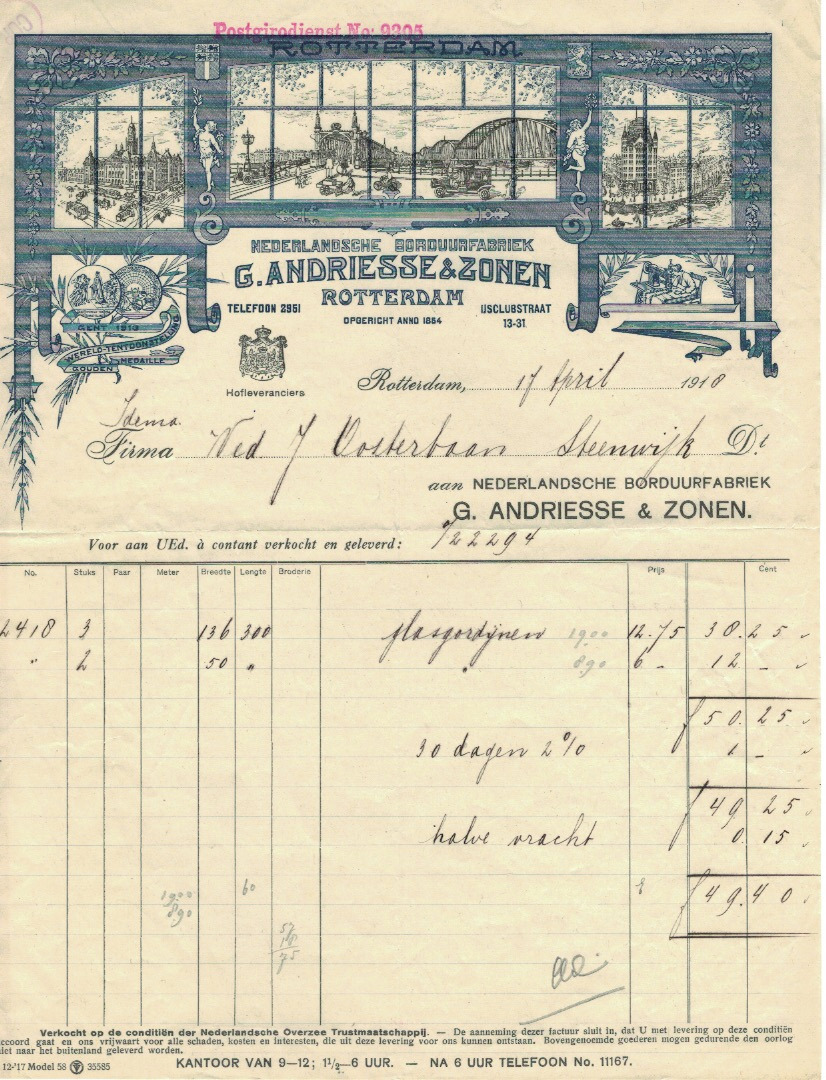 Ten Cate is originally a textile company, over 100 years old, as is illustrated by the invoices from 1908, illustrating the large weaving factories at that time. In fact the company was established in 1704 as hand craft and trading company.