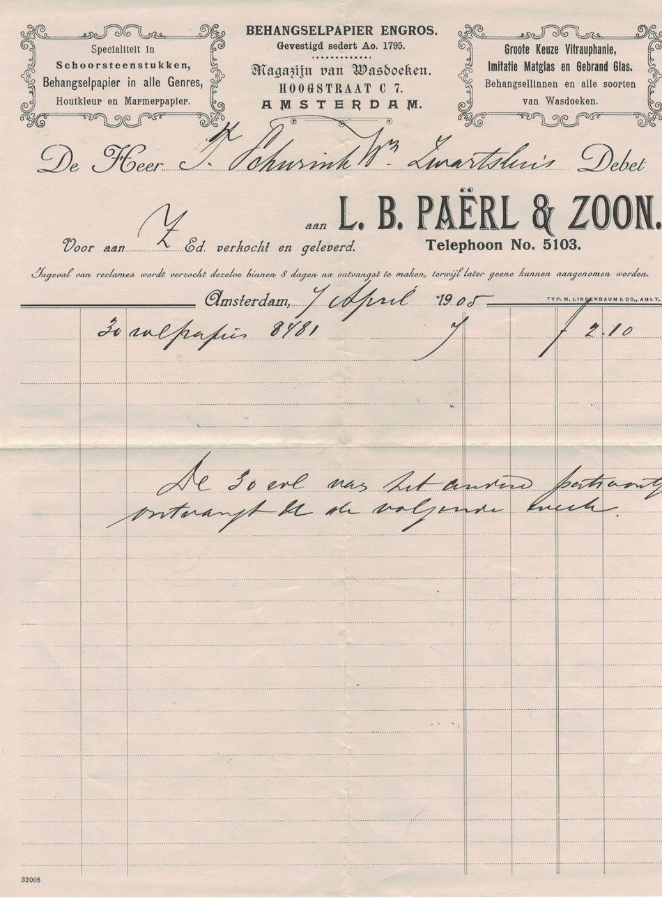 Paërl & Zoon, Behangselpapier Engros, Amsterdam, nota uit 1905