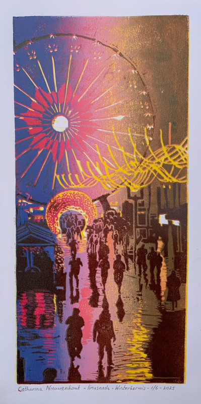 kleuren linosnede monoprint; oplage 1/6 exemplaren (de kleuren variëren enigszins)