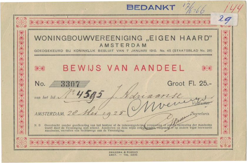 25 van het lid no. 4595 J. Adriaanse, Amsterdam 1925; 2 origin. handt.;