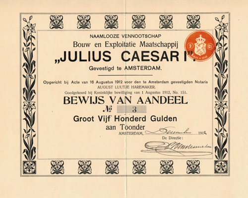 Bouw- en Exploitatie Maatschappij "Julius Caesar I", N.V., met fraaie bloemrijke Art Deco sierrand. Afm. ca. 28 x 22 cm. conditie EF, 1 nette middenvouw en rechts boven minieme sporen rood. Prijs € 50. |