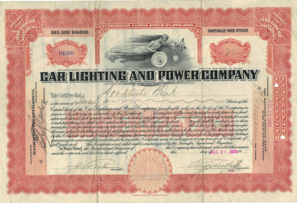 Certificate of < 100 shares, no. 01608, orange border, vignette: