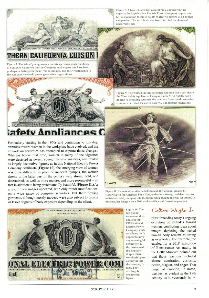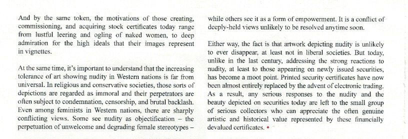 In zijn artikel in Scripophily no 124, mei 2024 p. 15, geeft Peter Longini in zijn artikel "The maked ladies of Wall Street" het volgende commentaar: "A bare chested but earnest man appears to be mansplaining the finer points of electric motors to his topless companion.